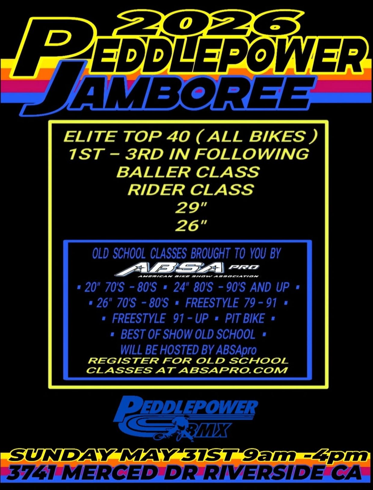 Make sure to join us on on May 31st for the 4th show of our season at the Peddlepower Jamboree in Riverside! ABSApro will be hosting the Old School BMX portion of the show. This is always a Huge Show with a big turnout of custom cruisers and old school BMX bikes. We are super stoked to be a part of Bill's show! Make sure to register online for the old school portion of of the show. We look forward to seeing you there!
